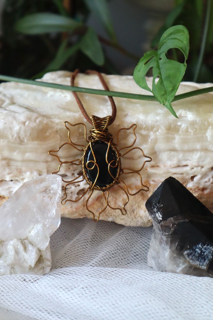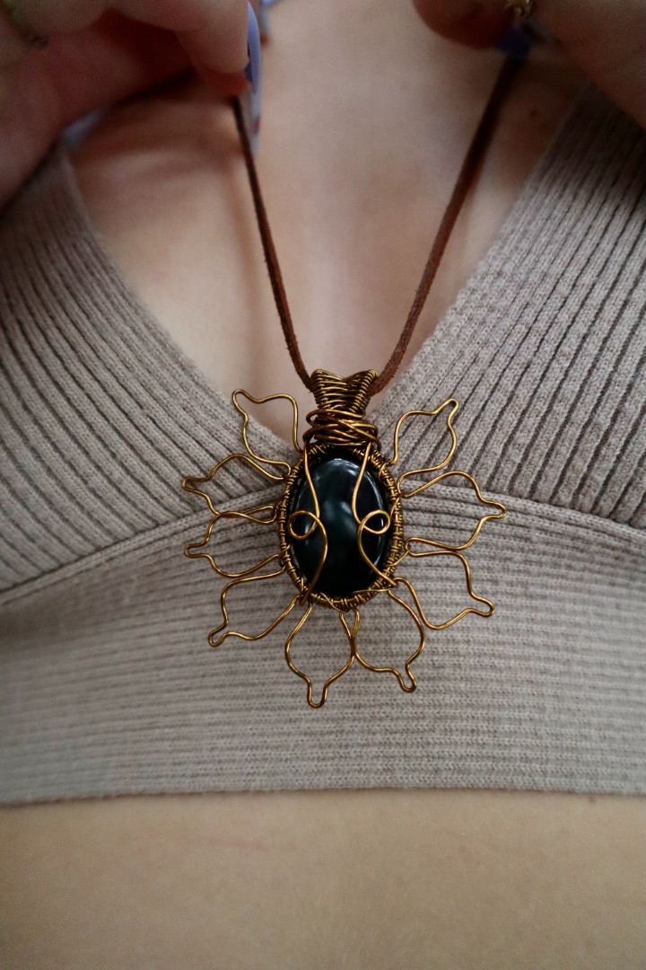 Black Obsidian wire wrapped sun pendant. Handmade jewelry piece, wrapped with bronze wire. This is a one-of-a-kind wire wrap. The colors complement each other very nicely, making this the perfect piece for everyday wear!