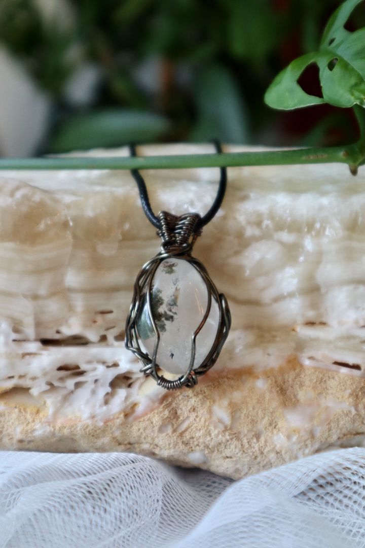 Beautiful Garden Quarts wire wrap. Handmade jewelry piece, wrapped with gun metal grey wire.