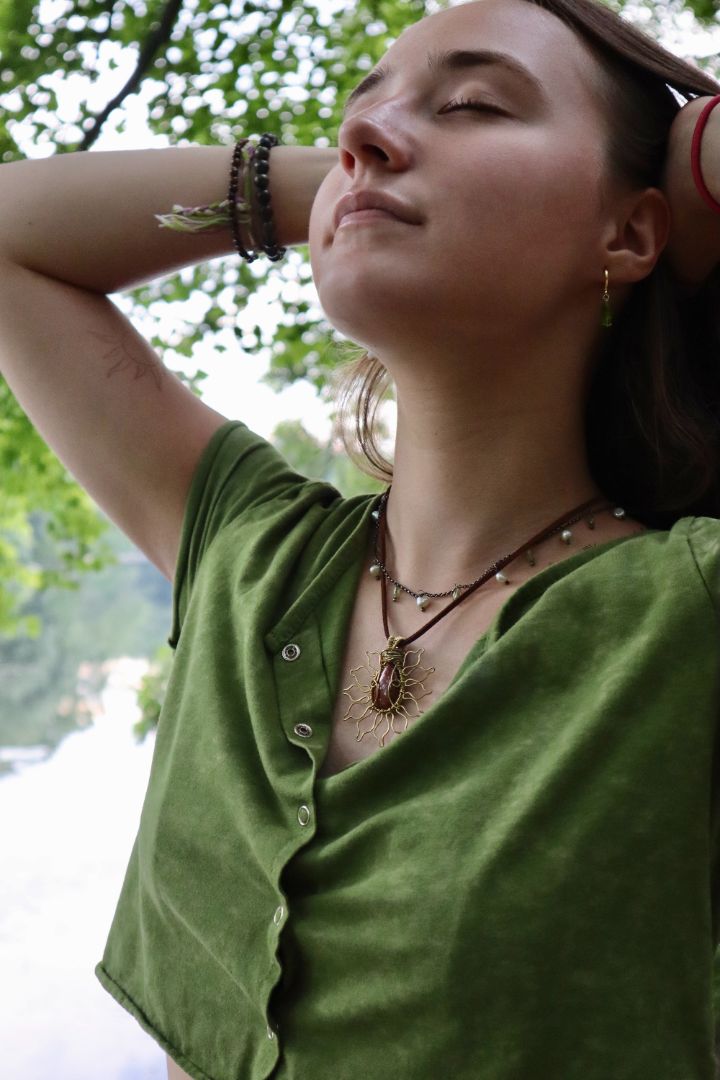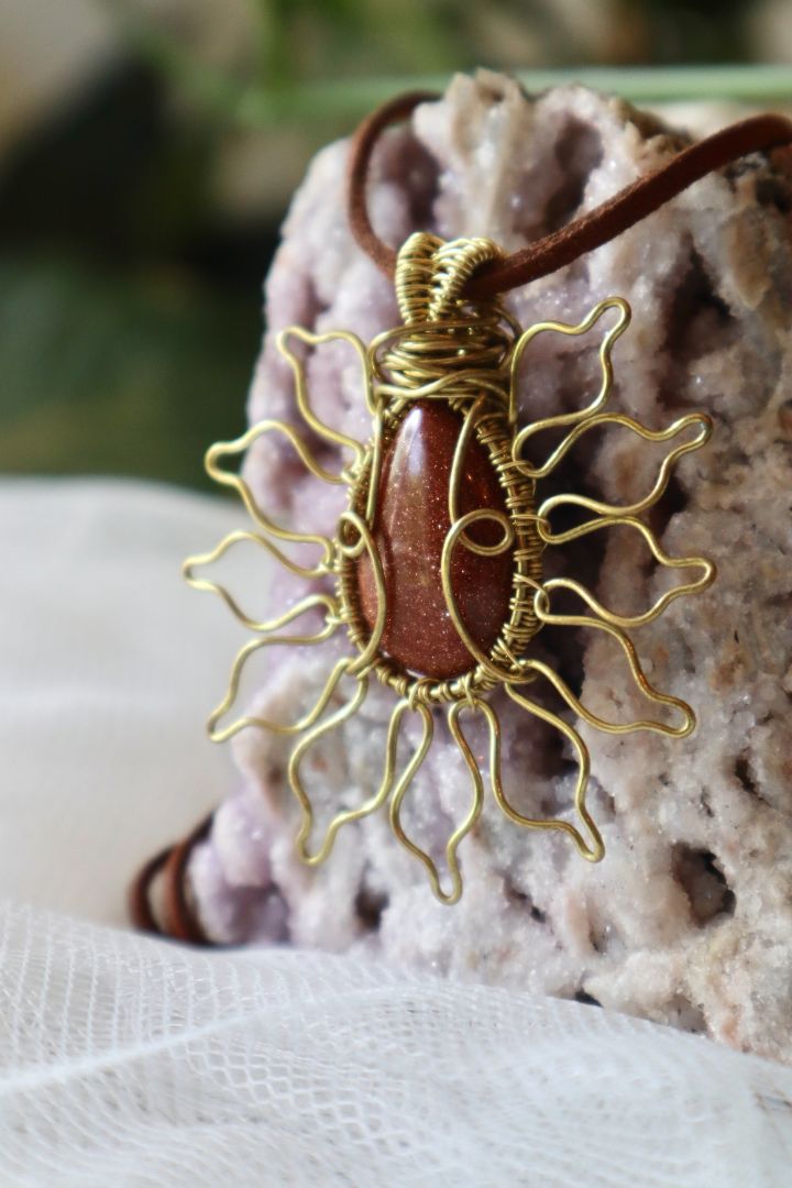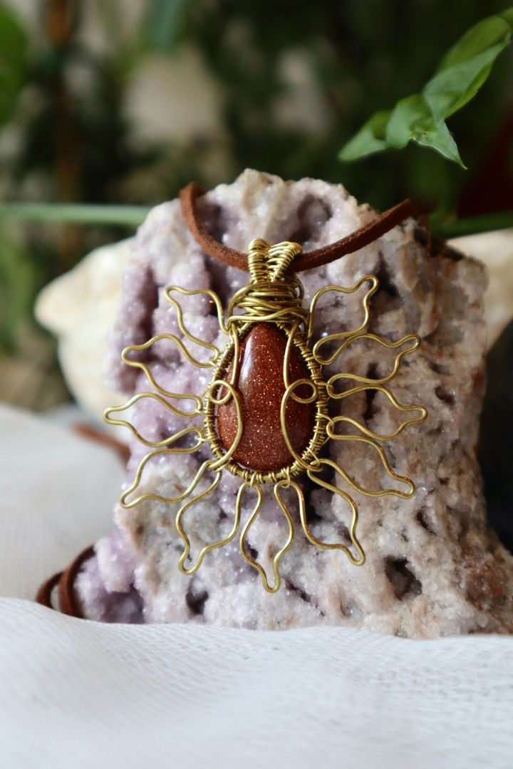 Wire wrapped Goldstone sun pendant. Handmade jewelry piece, wrapped in gold wire.