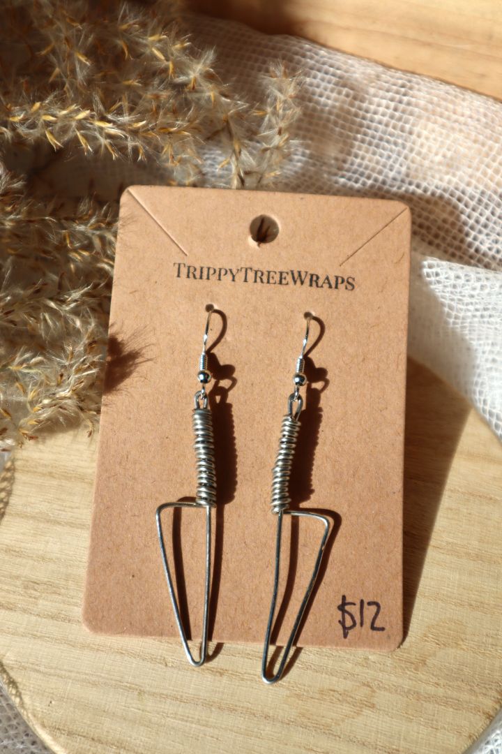 These wire wrapped knife shaped earrings add a unique, sassy, and sleek style to your everyday look. These earrings come in gold and silver.