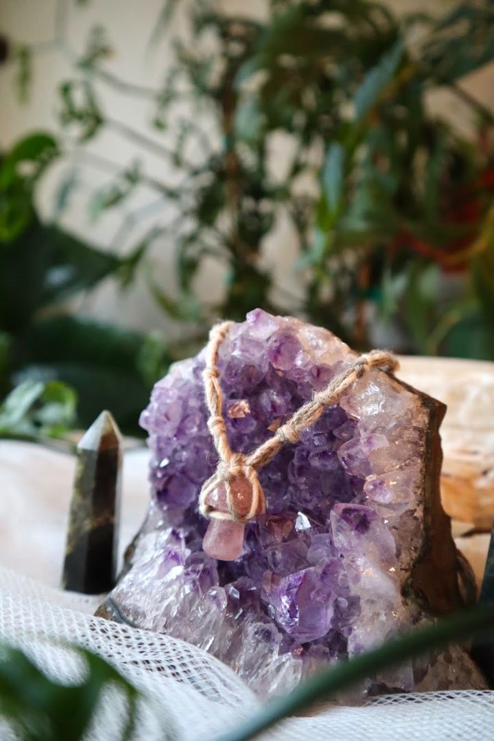 This is an adjustable multicolored neutral string macramé Necklace, with a beautiful Strawberry Quarts crystal as the main piece.