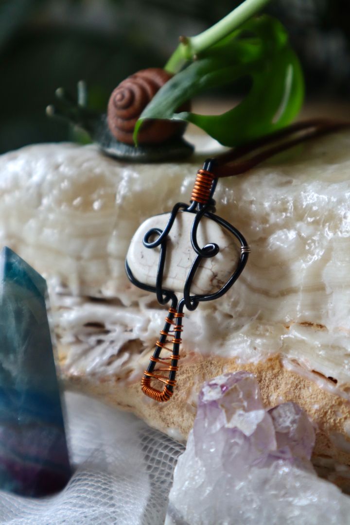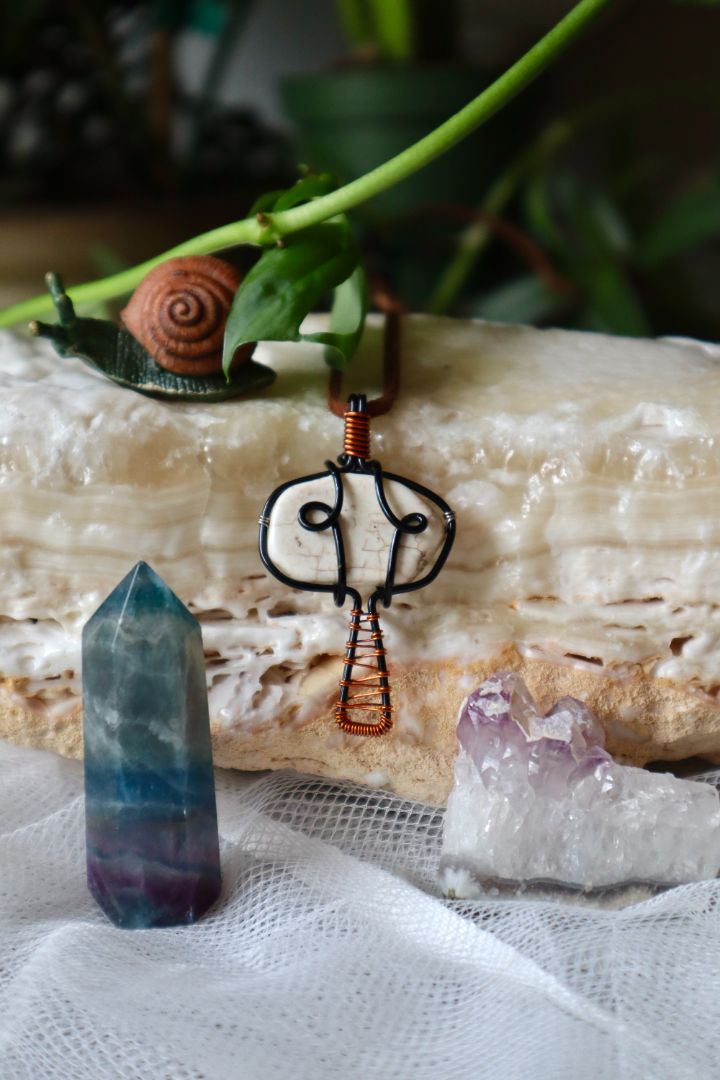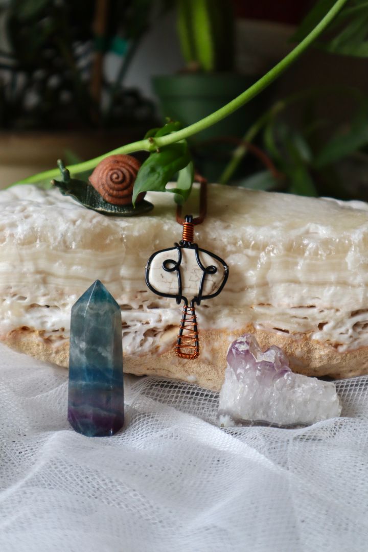 Handmade wire wrapped white synthetic crystal with brown veins. Mushroom silhouette made with black wire and copper wire.