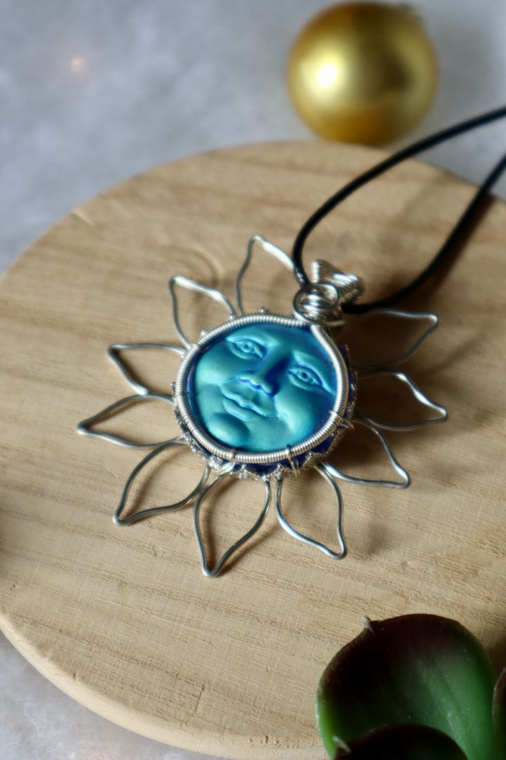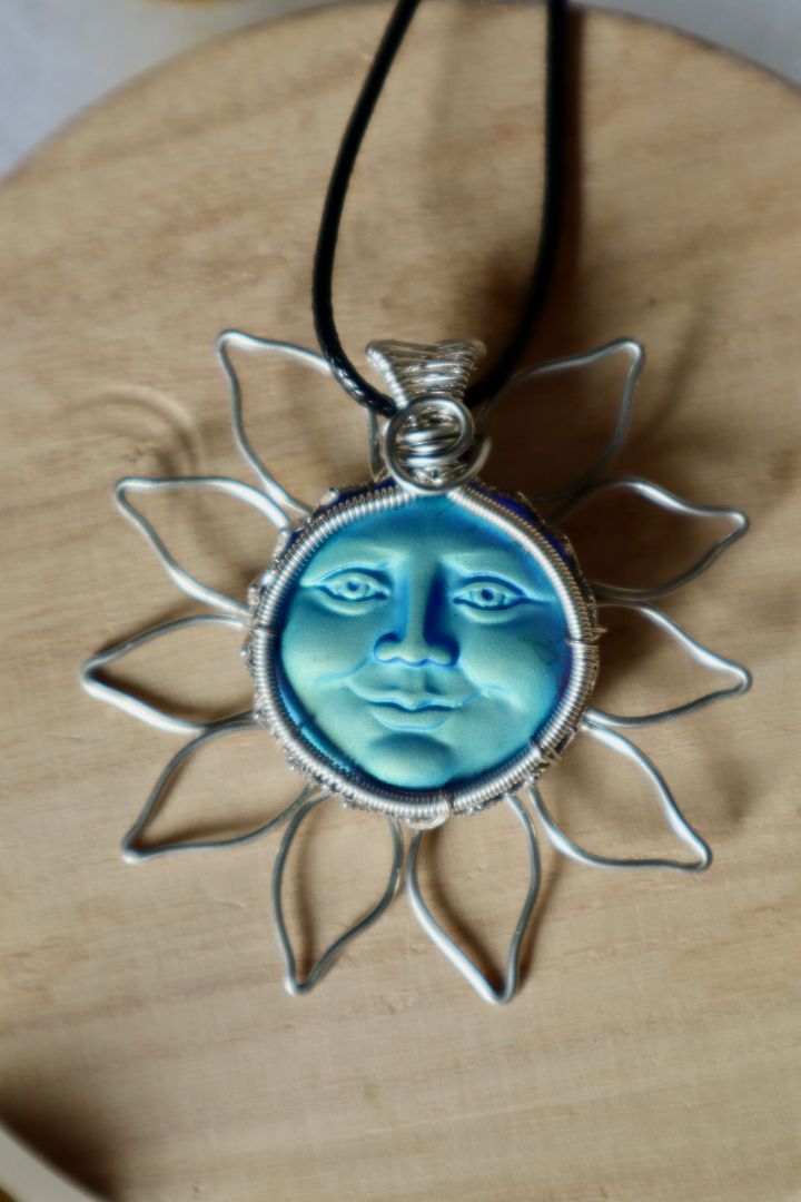 This piece is part of the Winter Solstice Collection! This blue face sun pendant is a fun statement piece perfect for a wintery look but can also be worn all year round! This pendant is made with a light silver wire and a carved face synthetic crystal.