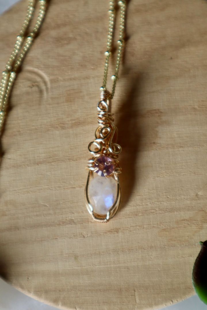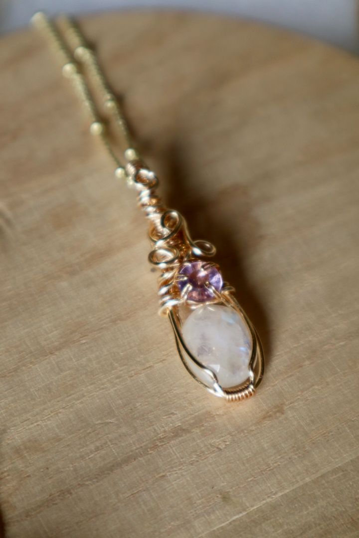 This piece is part of the Winter Solstice Collection! This is a dainty and elegant light gold pendant with a beautiful Moonstone and faceted Amethyst. This pendant can be worn all year round and can be paired with any style to elevate it!